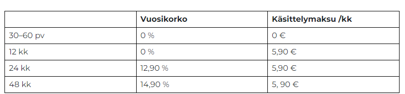 12 kk maksuaika. Vuosikorko: 0 %. Käsittelymaksu/kk: 5,90 €.